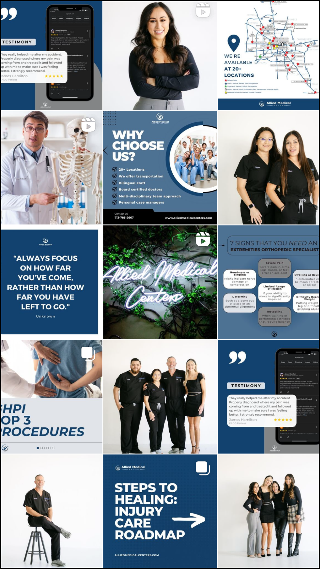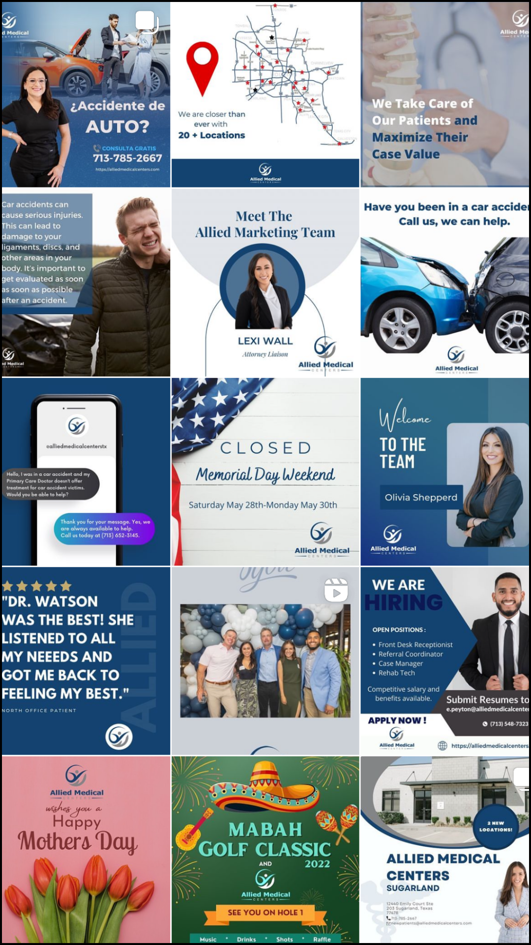 Our solution for Allied Medical Centers involved implementing a comprehensive posting schedule, consisting of four weekly posts, including reels, to maximize engagement. Recognizing the importance of reels as an underutilized tool, we integrated them into our content strategy to enhance visibility and appeal. Given their target audience of personal injury attorneys, we highlighted the faces of Allied's marketers, emphasizing their role as liaisons between attorneys and the clinic. Additionally, we initiated a monthly giveaway series for local events to boost brand recognition and local reach. To give their social media a more cohesive, professional feel, we organized brand shoots to create consistent and visually appealing content. By seamlessly blending reels and feed posts into a cohesive content feed, we achieved remarkable results, increasing reach by 1,300%, website taps by 224%, and nearly tripling their following within six months. Notably, the reels frequently reached ten times the number of followers, significantly contributing to heightened brand awareness and follower growth. Finally, we implemented email marketing to leverage and build on their current community, sending out a monthly newsletter to promote services and giveaways. This approach has helped Allied Medical Centers stay top of mind and increase website clicks by 15% in the last two months.
